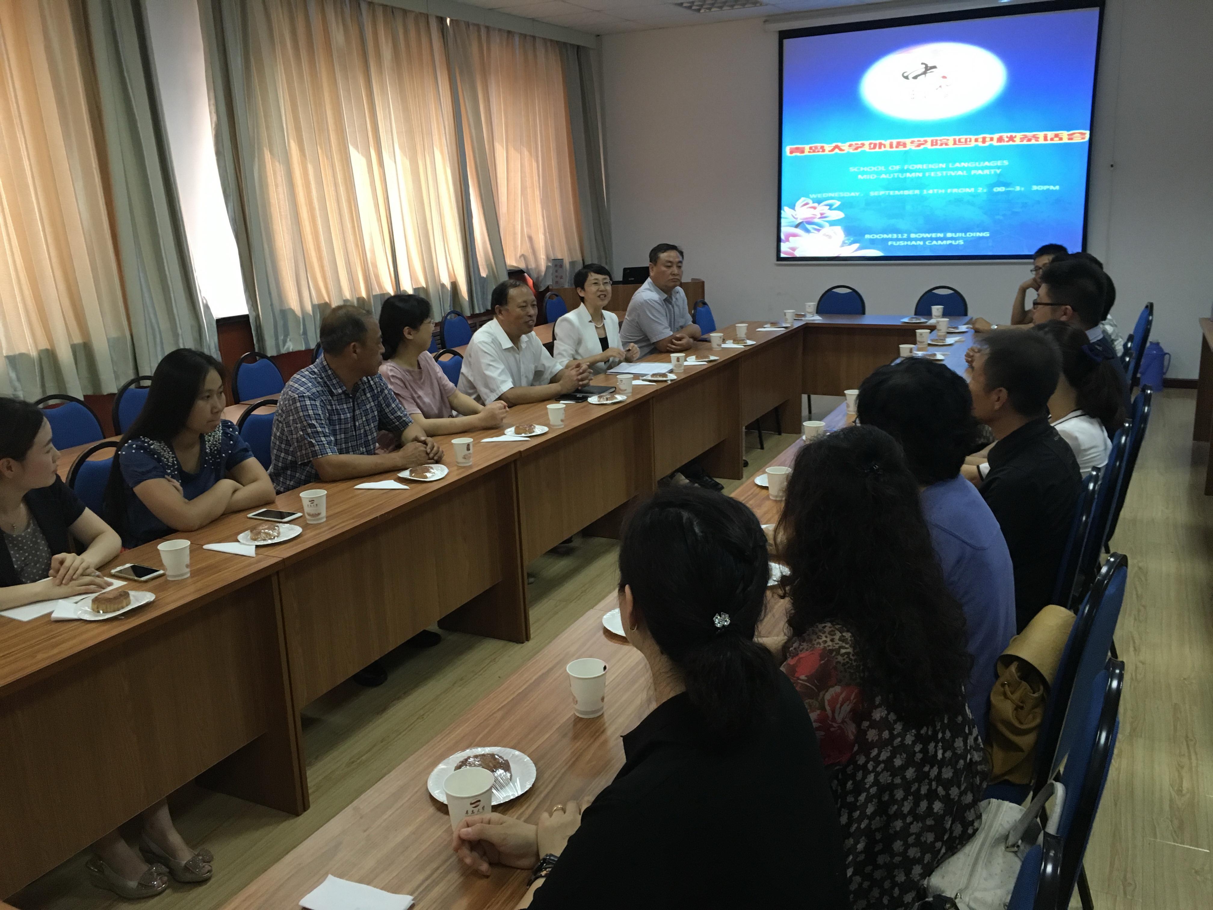 在博文楼312会议室举行中外教师茶话会,共迎中国传统节日—中秋佳节。各教学系教师代表、与外籍教师对接服务的中教教师、学院党政领导以及办公室相关人员参加茶话会。